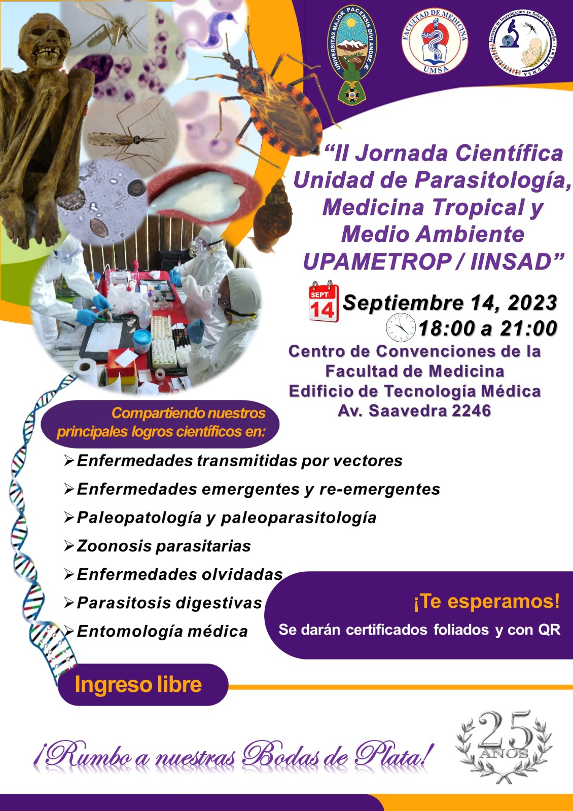 El 14 de septiembre, por motivo del 24 Aniversario del IINSAD, se desarrollarán la II Jornada Científica de UPAMETROP, será en el Centro de Convenciones de la Facultad de Medicina, Enfermería, Nutrición y Tecnología Médica, a las 18:00 horas.